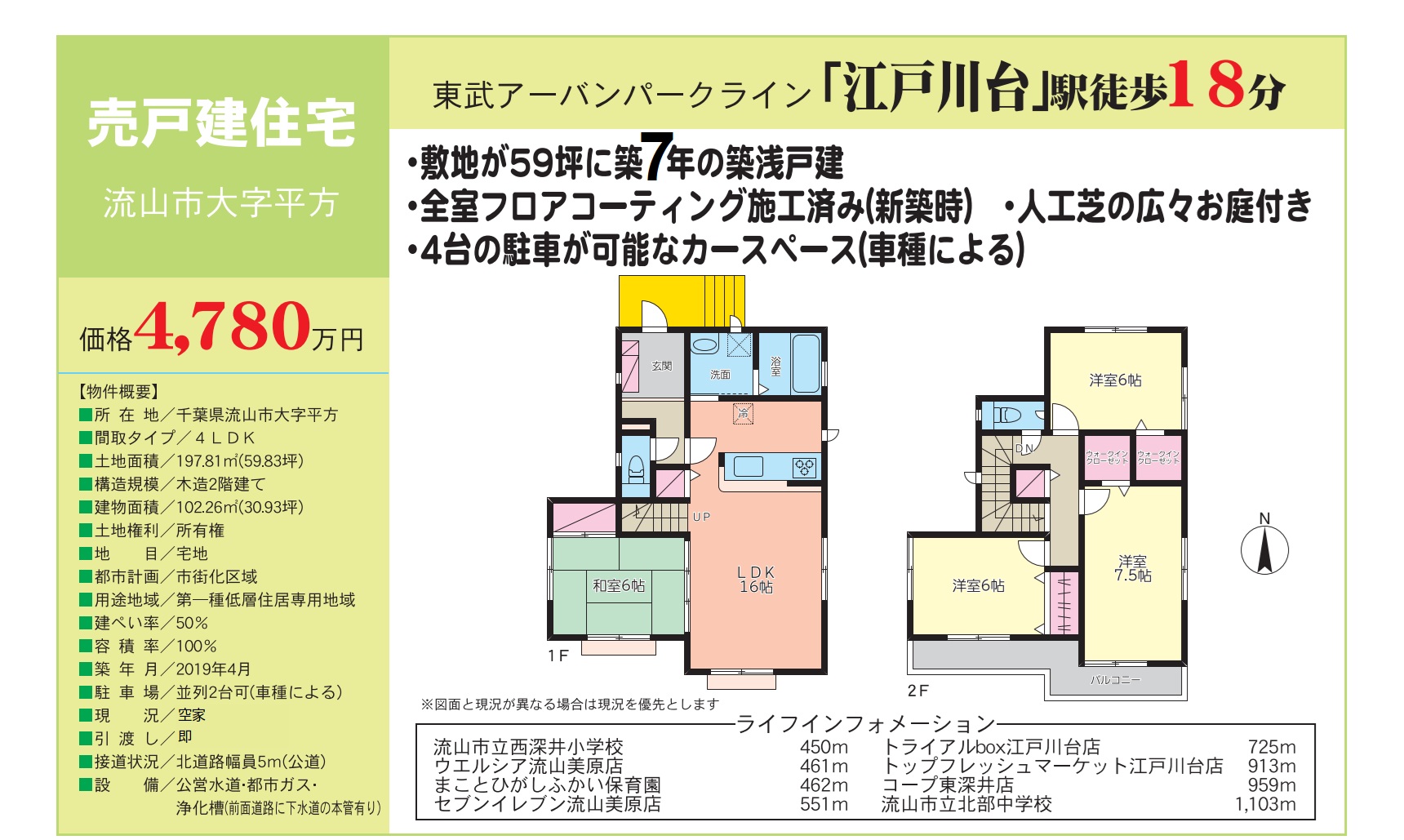流山市大字平方 中古戸建 4,780万円 敷地はゆとりのある59坪